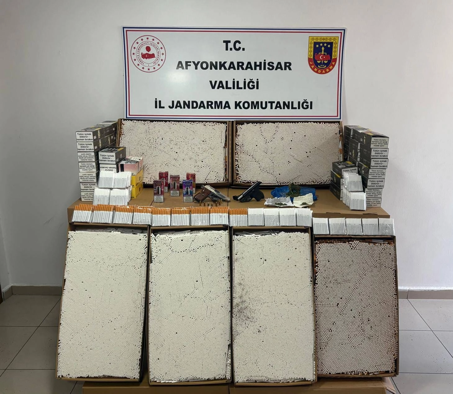 Afyonkarahisar İl Jandarma Komutanlığı ekipleri, kent merkezinde gerçekleştirdikleri operasyonda önemli miktarda uyuşturucu madde, 72 bin 940 adet doldurulmuş makaron, elektronik sigaralar, ruhsatsız tabancalar ve mermiler ele geçirdi. Operasyonda E.A. ve F.Ç. isimli şahıslara adli işlem uygulandı. Ayrıca, hakkında 20 yıl kesinleşmiş hapis cezası bulunan A.B. de yakalanarak cezaevine teslim edildi. Bu başarılı operasyonlar, Afyonkarahisar'da asayişin sağlanması ve suçla mücadeledeki kararlılığın bir göstergesi olarak değerlendiriliyor.