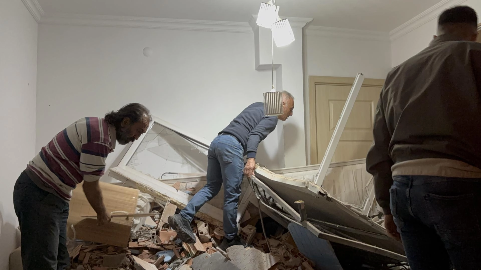 Çarpma nedeniyle evin oturma odasına ait duvarın bir bölümü yıkıldı.
