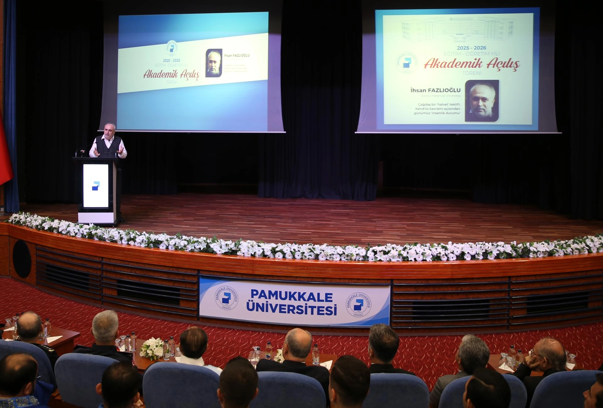 Pamukkale Üniversitesi'nin 2025-2026 Akademik Yılı Açılış Töreni, Prof. Dr. Hüseyin Yılmaz Kongre ve Kültür Merkezi'nde gerçekleşti. Vali Ömer Faruk Coşkun, eğitimin bir milletin geleceği için önemine değinerek, PAÜ'nün şehrin ve ülkenin üretken ruhu olduğunu ifade etti. Rektör Prof. Dr. Mahmud Güngör, üniversitelerin hakikat arayışını ve insanlığa değer katma idealini vurguladı. İstanbul Medeniyet Üniversitesi Bilim Tarihi Enstitüsü Müdürü Prof. Dr. İhsan Fazlıoğlu'nun sunumuyla devam eden törene, Büyükşehir Belediye Başkan Vekili Ali Marım, İl Jandarma Komutanı Tuğgeneral Mevlüt Dirim, İl Emniyet Müdürü Yavuz Sağdıç, AK Parti İl Başkanı Muhammet Subaşıoğlu, akademisyenler ve öğrenciler katıldı.