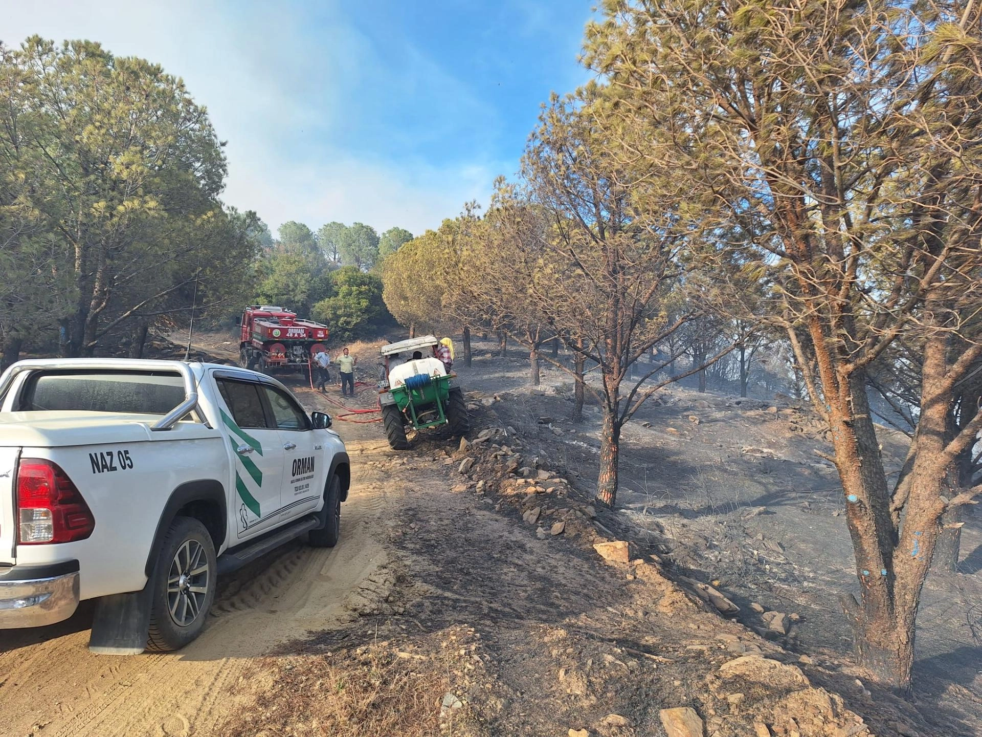 Rüzgarın etkisiyle ormanlık alana sıçrayan yangının söndürme çalışmalarına vatandaşların yanı sıra Bozdoğan Belediyesi de arazöz, kepçe ve tankerlerle destek verdi.