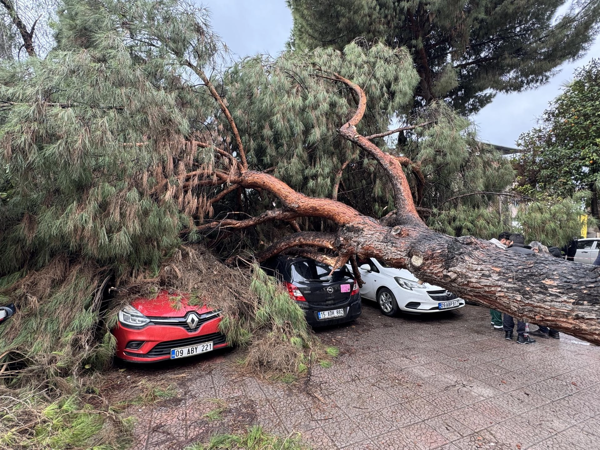 AYDIN (AA) - Aydın'ın Efeler ilçesinde hastane bahçesindeki çam ağacının devrilmesi sonucu park halindeki 4 otomobilde hasar oluştu,