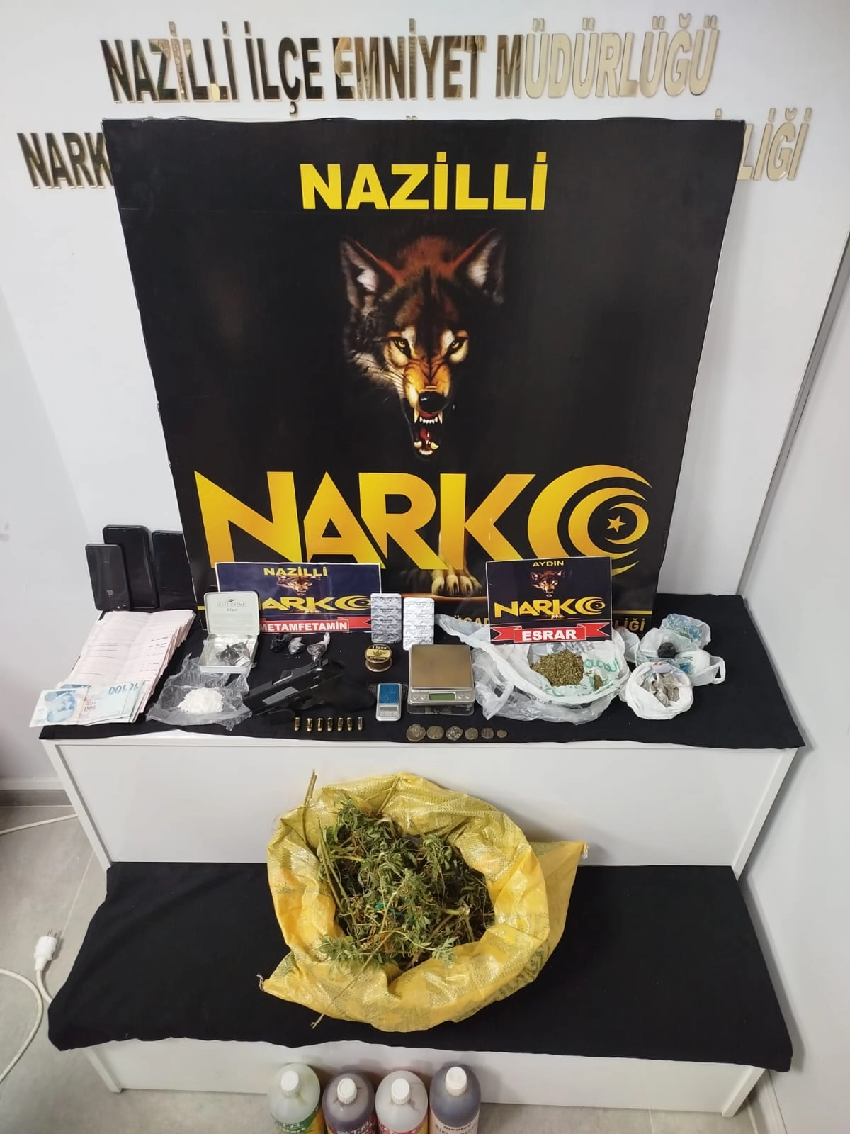 Aydın'ın Nazilli ilçesinde İlçe Emniyet Müdürlüğü Narkotik Suçlarla Mücadele Büro Amirliği ekiplerince yapılan operasyonlarda L.Ç, M.Z. ve B.A. isimli şahıslar gözaltına alındı. Adreslerde yapılan aramalarda yüklü miktarda sentetik uyuşturucu, esrar, sentetik ecza, ruhsatsız tabanca ve uyuşturucu madde imalatında kullanılan malzemeler ele geçirildi. Zanlılardan L.Ç. ve B.A. tutuklanırken, M.Z. adli kontrol şartıyla serbest bırakıldı. Olayla ilgili soruşturma devam ediyor.