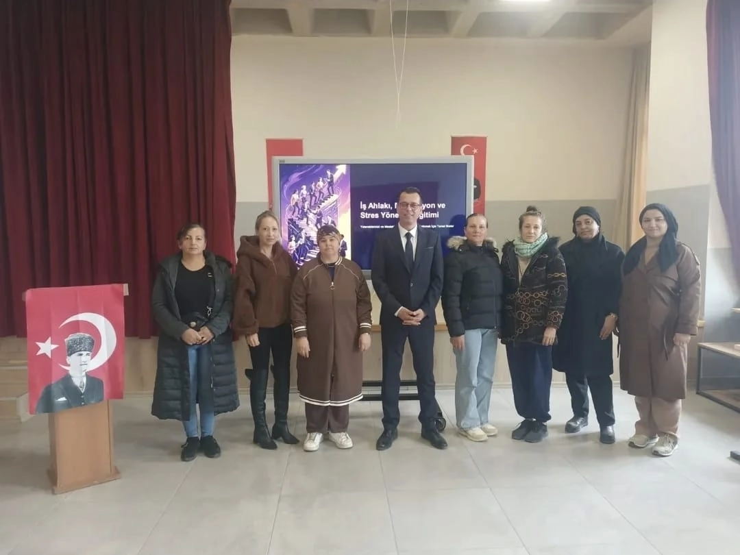 Datça İlçe Milli Eğitim Şube Müdürü Emre Birgül tarafından verilen eğitimlerde, iş ahlakı, motivasyon ve stres yönetimi, kişiler arası ilişkiler ve etkili iletişim, finansal okuryazarlık, kadına yönelik şiddetle mücadele başlıklarında bilgiler paylaşıldı.