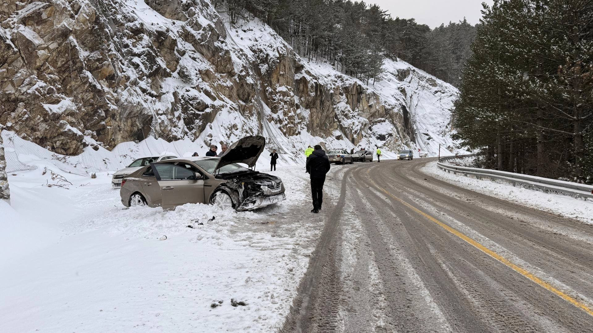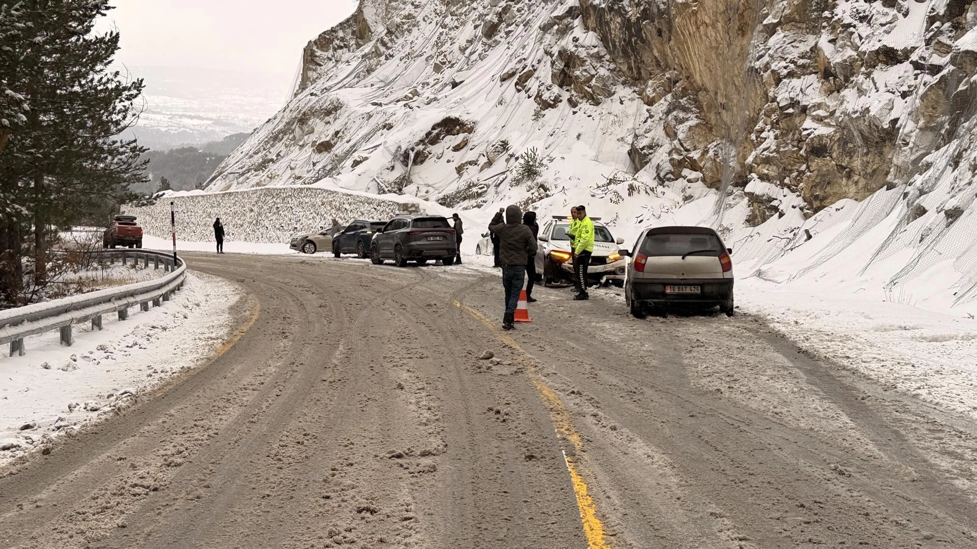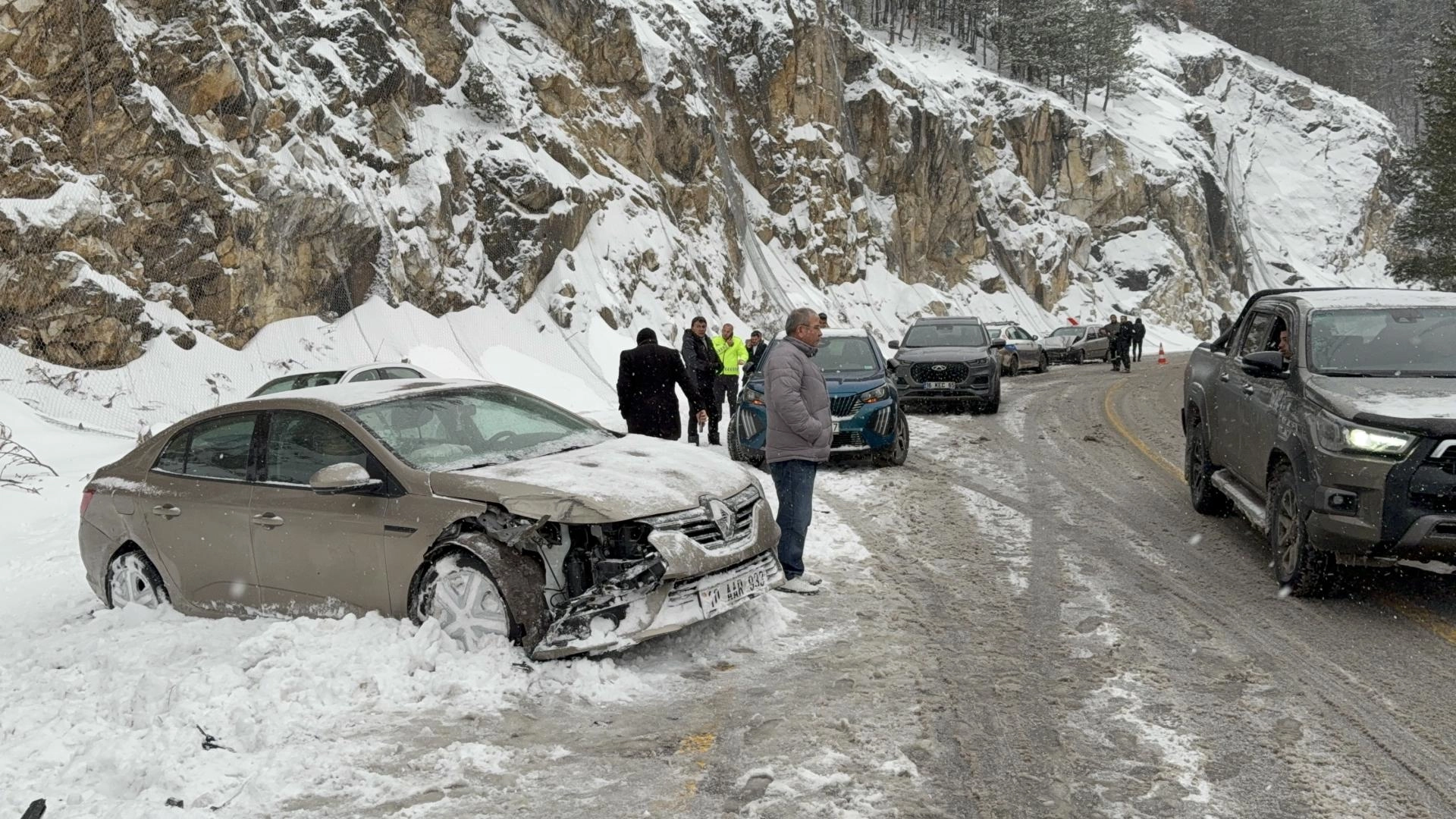 Öte yandan Domaniç–İnegöl kara yolunda kar yağışı ve buzlanma nedeniyle aynı noktada meydana gelen iki ayrı kazada, aralarında polis aracının da bulunduğu 4 araçta hasar oluştu.