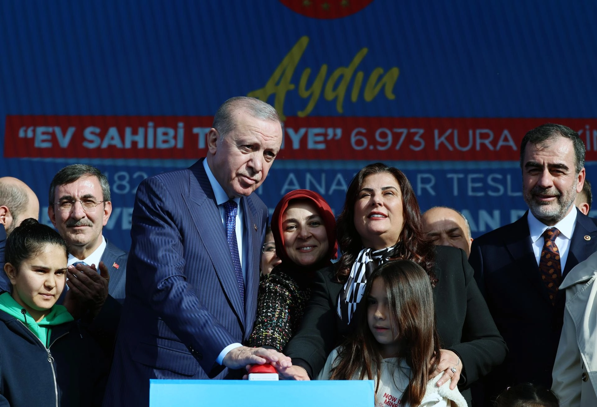 Erdoğan, Aydın Büyükşehir Belediyesi önünde düzenlenen, "Ev Sahibi Türkiye" 6 bin 973 Kura Çekimi, 1482 Konut Anahtar Teslimi, Şehir Hastanesi ve Yapımı Tamamlanan Diğer Yatırımların Toplu Açılış Töreni'ne katıldı.