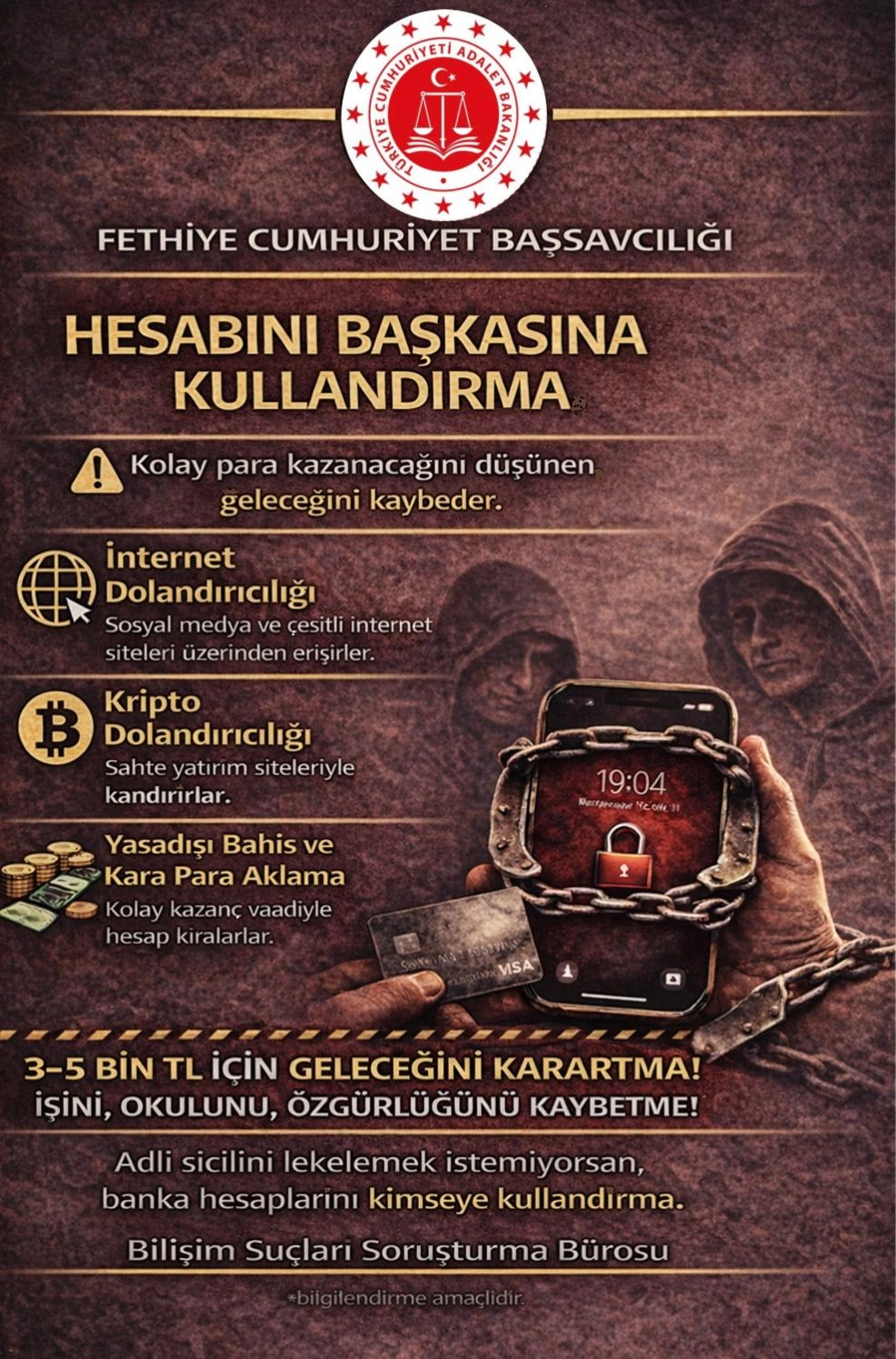 "Bu durumun ise gençlerin sanık konumuna düşmelerine ve telafisi güç mağduriyetler yaşamalarına yol açtığı gözlemlenmektedir. Cumhuriyet Başsavcılığımız tarafından hazırlanan dijital materyal, afiş ve broşür, bilişim yoluyla dolandırıcılık suçlarının önlemesi hakkında farkındalık oluşturmayı amaçlayan bir bilgilendirme çalışmasıdır. Bu kapsamda, üniversite öğrencileri ve lise son sınıf öğrencilerine yönelik olarak gönüllülük esaslı bilgilendirme faaliyetleri İlçe Emniyet Müdürlüğü, İlçe Milli Eğitim Müdürlüğü, Gençlik Spor İlçe Müdürlüğü ve Muğla Sıtkı Koçman Üniversitesi Fethiye Fakülte Dekanlıkları tarafından Cumhuriyet Başsavcılığımız koordinesinde devam etmektedir."