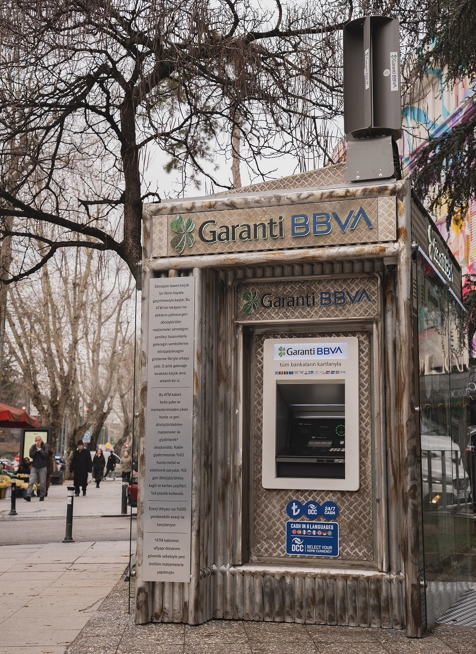 Garanti BBVA çalışanının küçük bir fikriyle başlayan anlamlı dönüşüm hikayesinin ürünü olan ve enerjisinin yüzde 100'ünü yenilenebilir kaynaklardan alan ATM, tamamı atık ve hurdadan üretilmiş malzemelerle giydirildi.