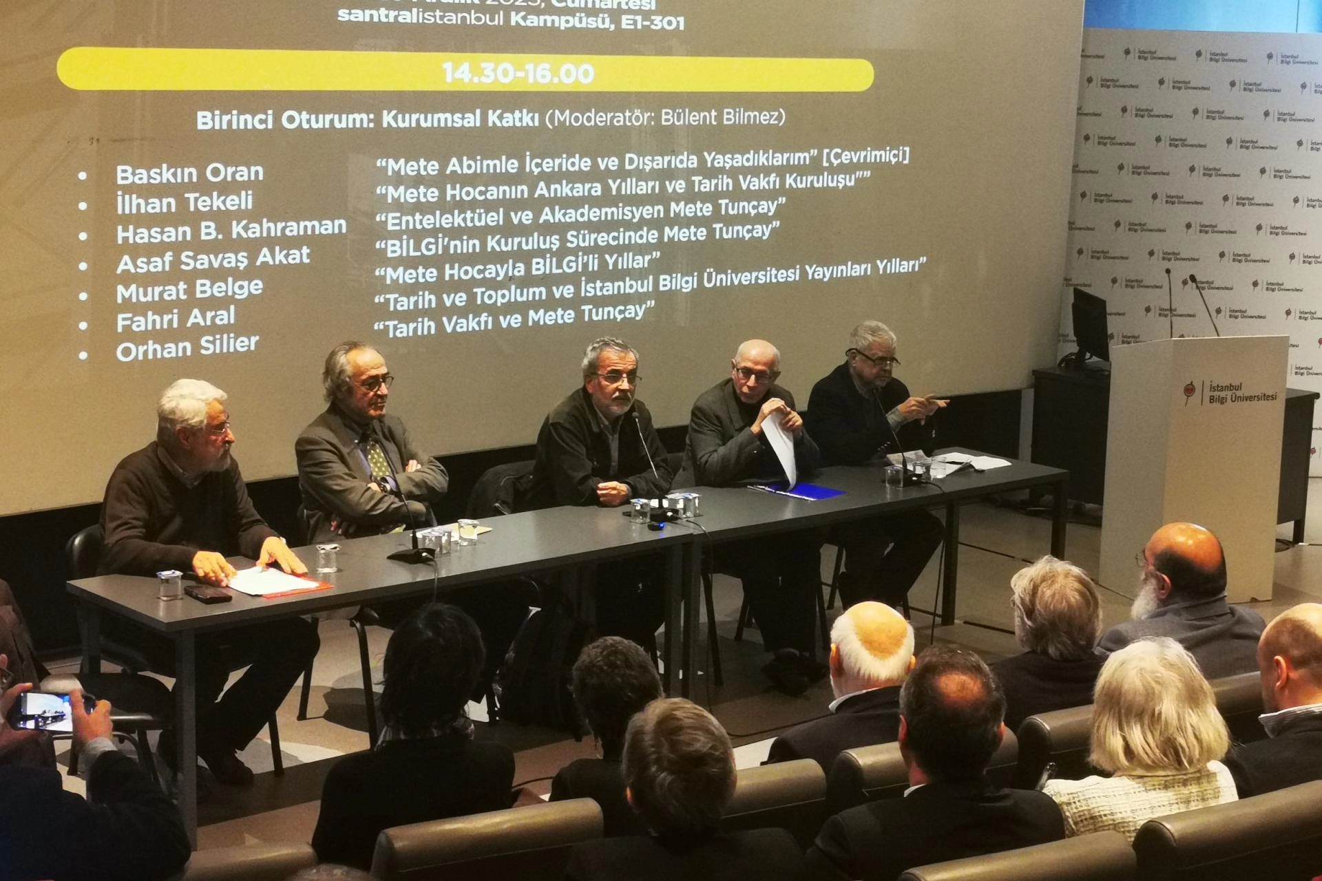 Prof. Dr. Bülent Bilmez'in moderatörlüğünde gerçekleştirilen ilk oturumda, Prof. Dr. Baskın Oran, Prof. Dr. İlhan Tekeli, Prof. Dr. Hasan Bülent Kahraman, Prof. Dr. Asaf Savaş Akat ve Tarih Vakfı'nın kurucularından Orhan Silier söz aldı.
