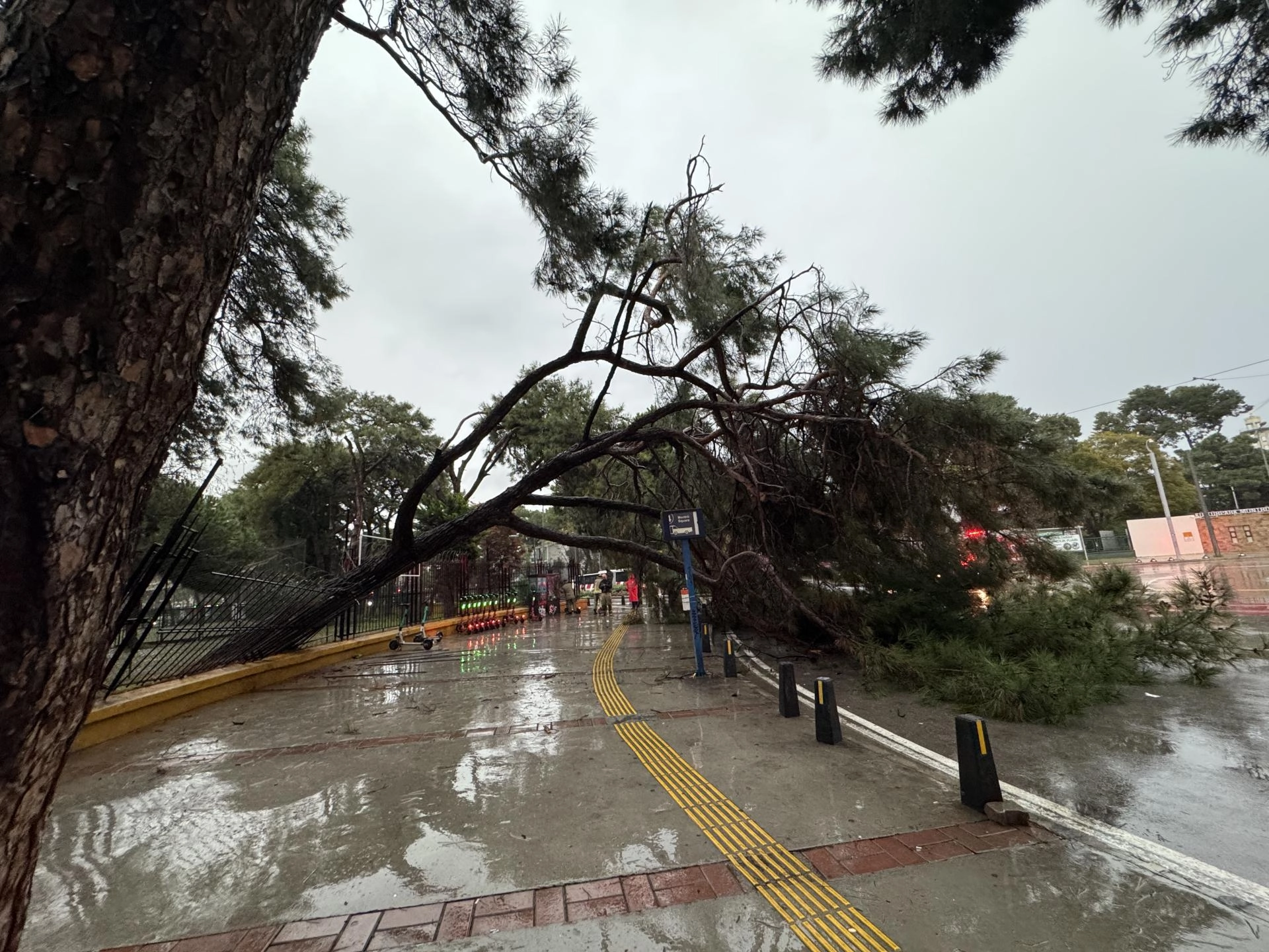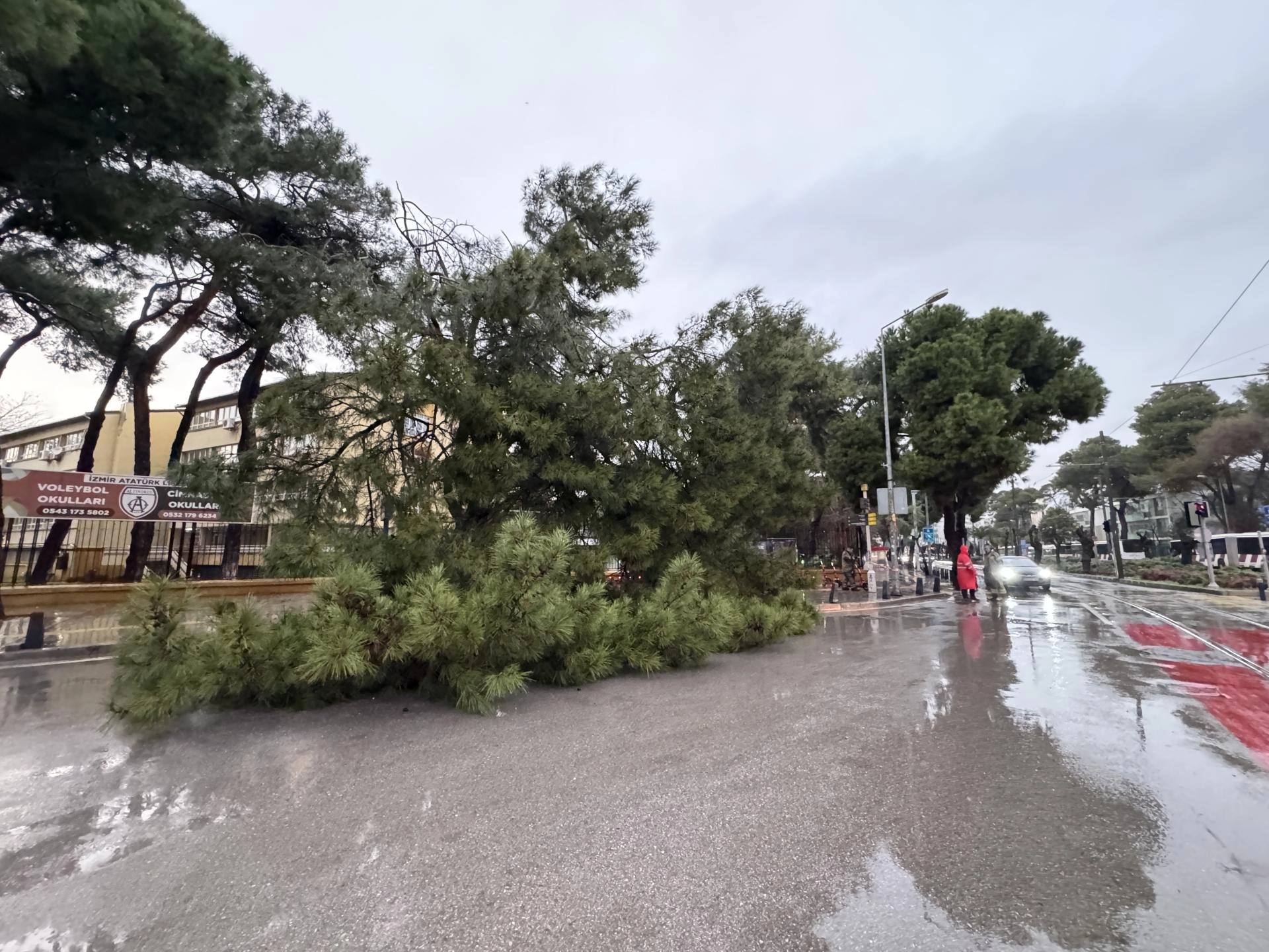 İzmir Atatürk Lisesi bahçesindeki bir çam ağacının yola devrilmesi üzerine, itfaiye ekipleri bölgede çalışma yaptı.