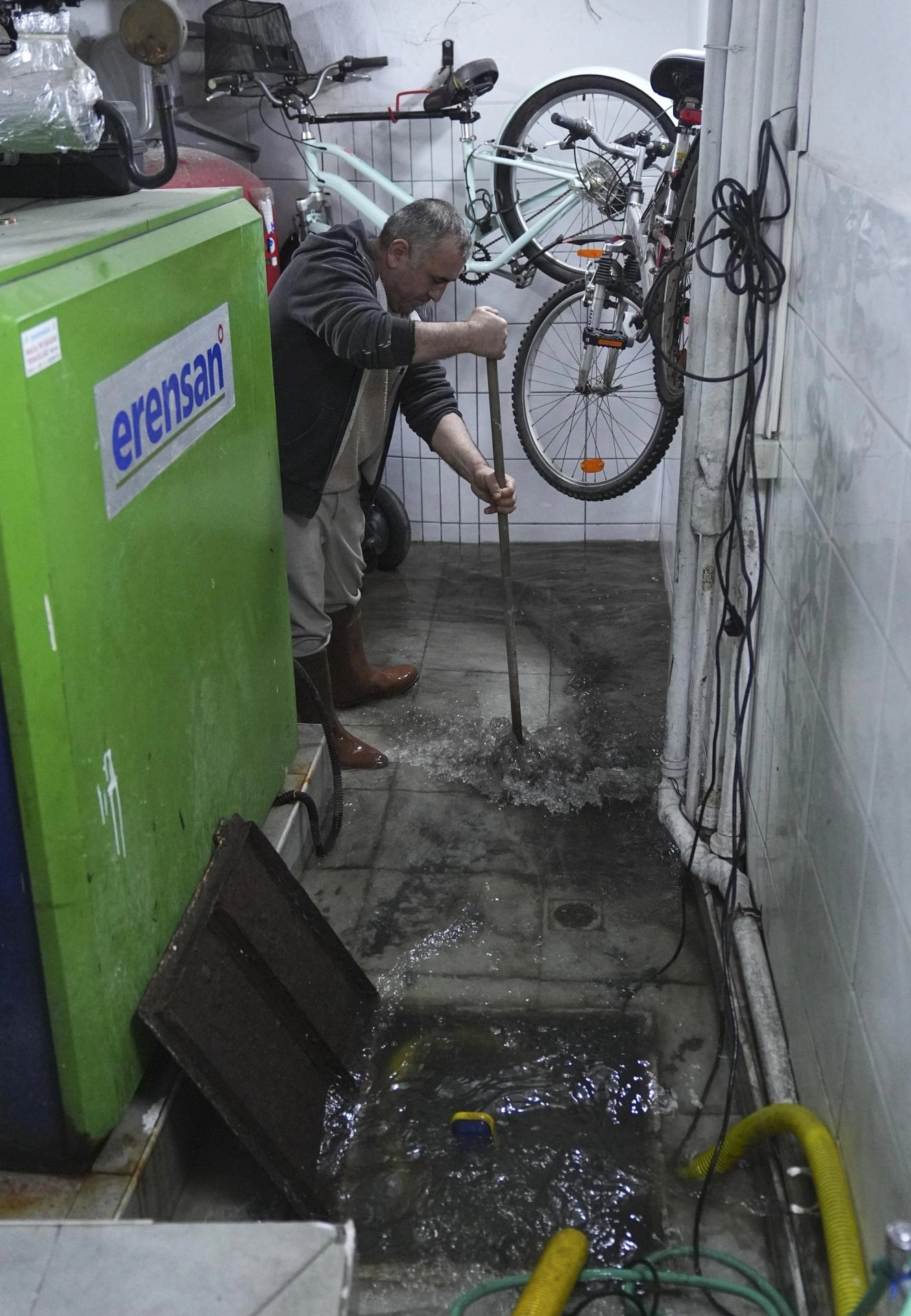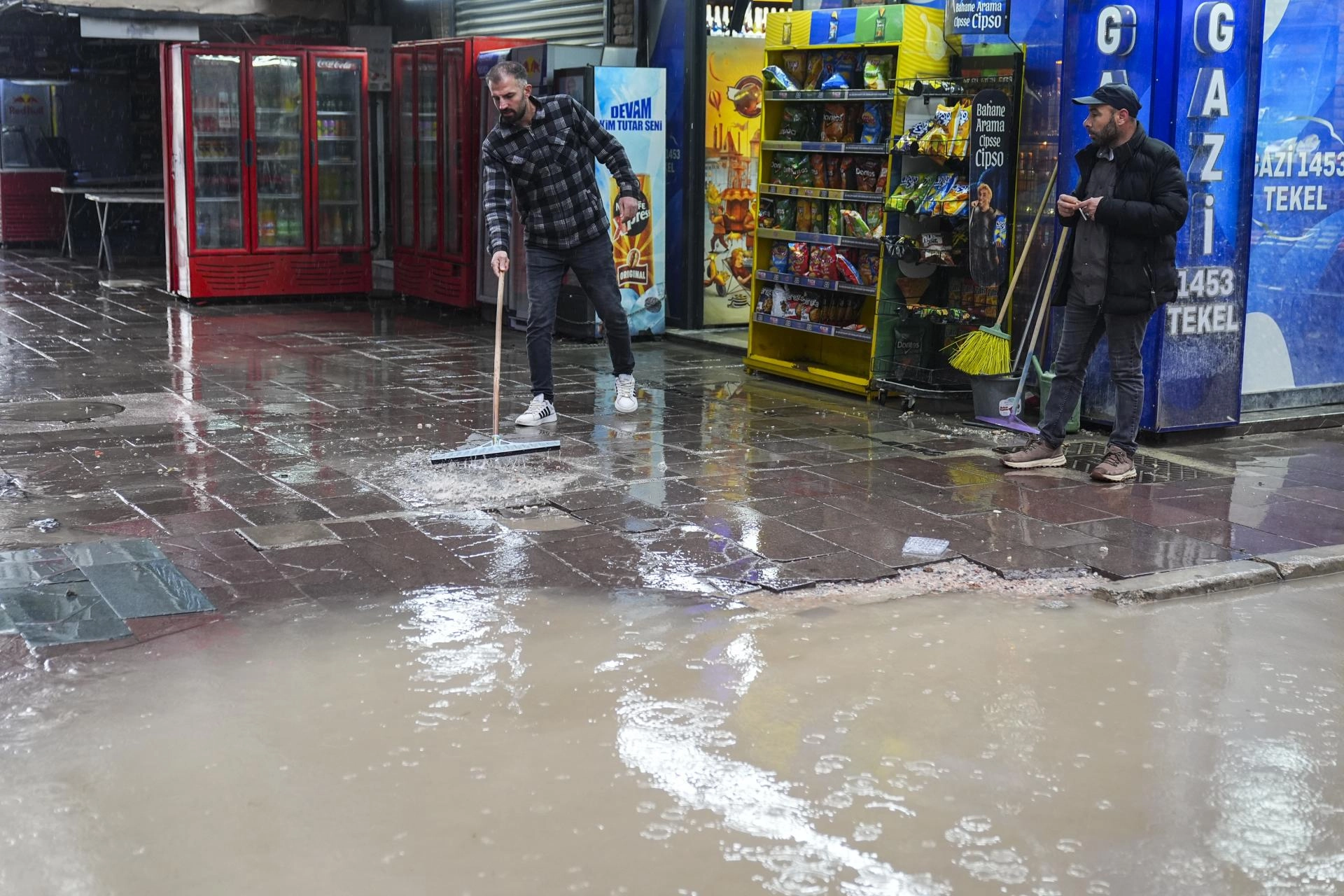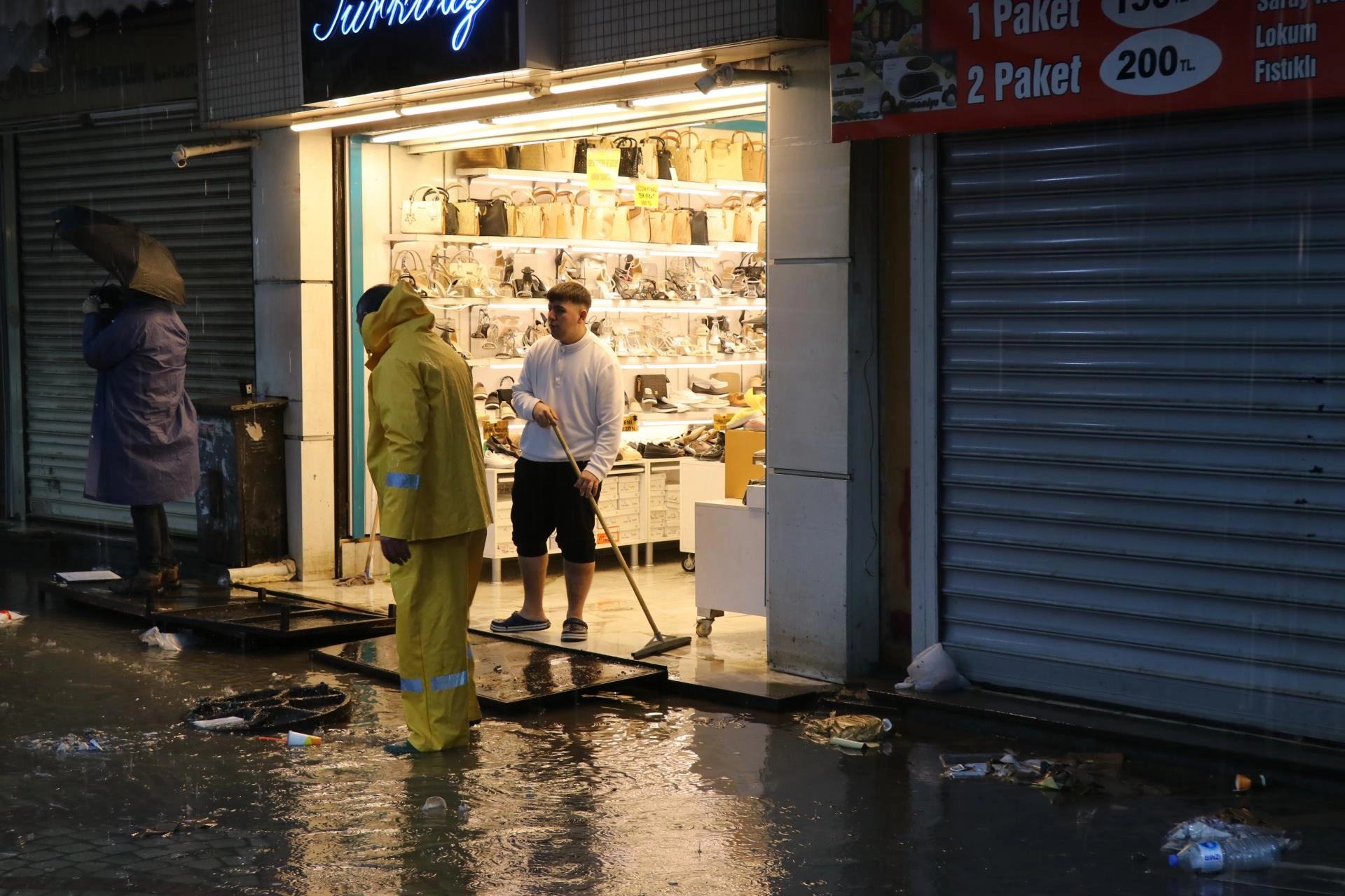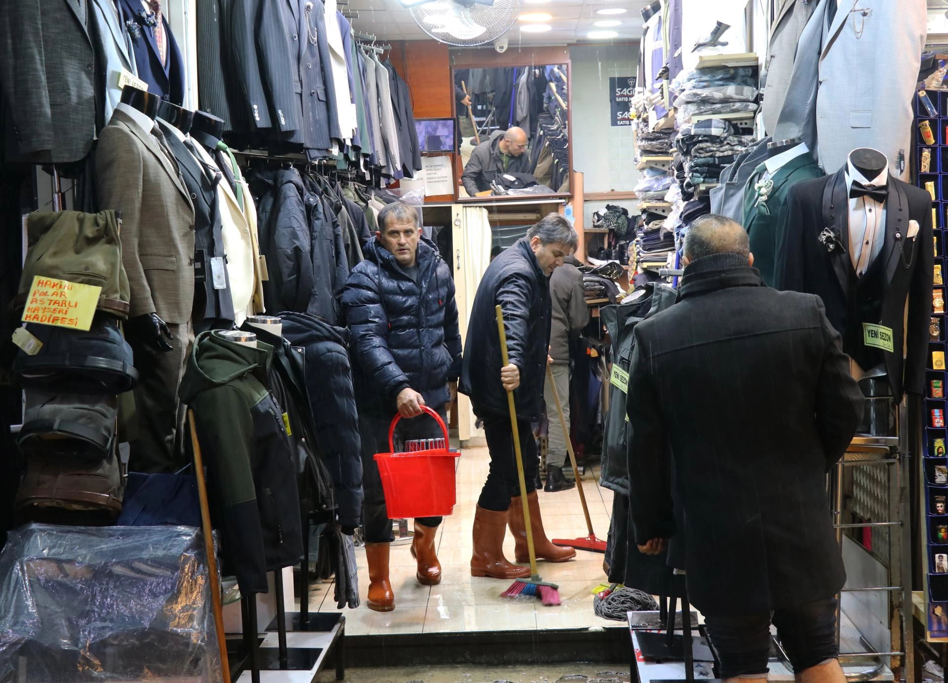 Esnaf, dükkanlarında biriken suyu fırça yardımıyla tahliye etmeye çalıştı.