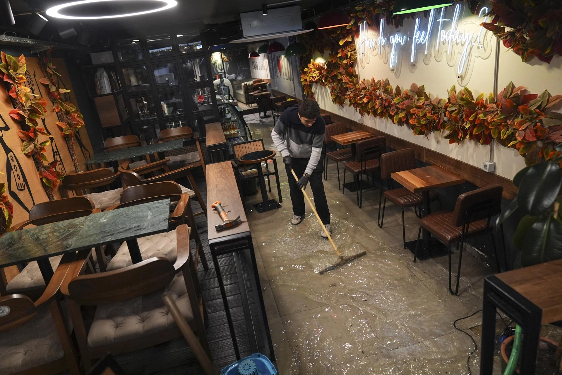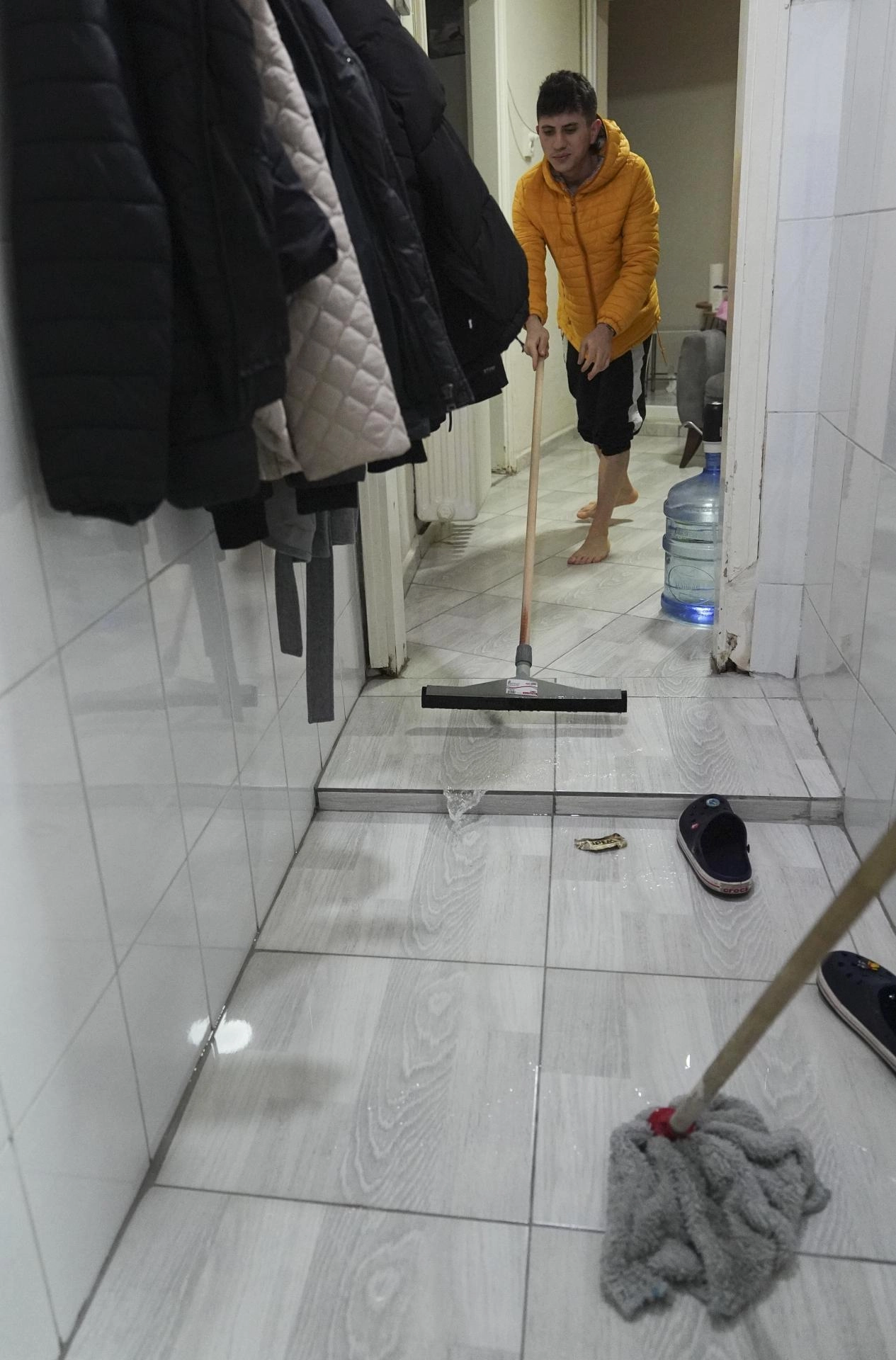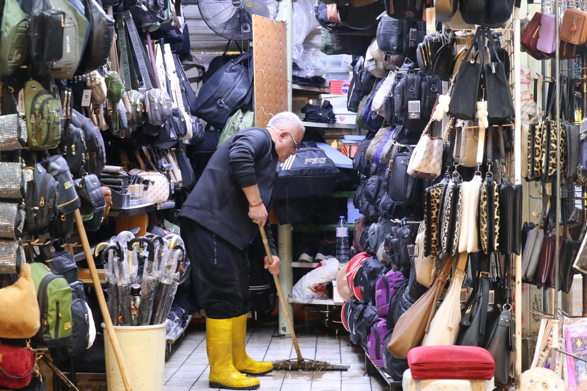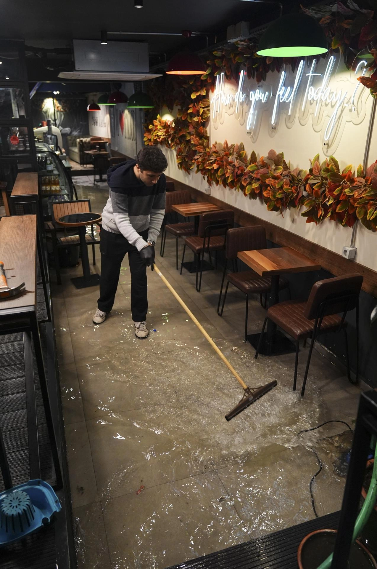 Esnaf, dükkanlarında biriken suyu fırça yardımıyla tahliye etmeye çalıştı.