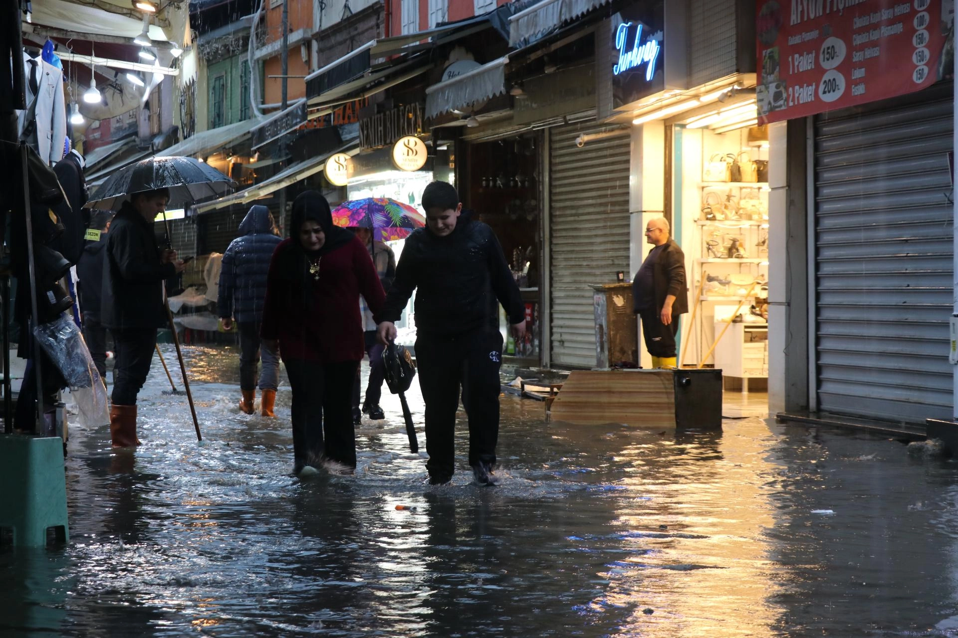 Konak ilçesindeki bazı caddelerle Kemeraltı Çarşısı'ndaki bazı iş yerlerinde sağanak nedeniyle su baskınları meydana geldi.