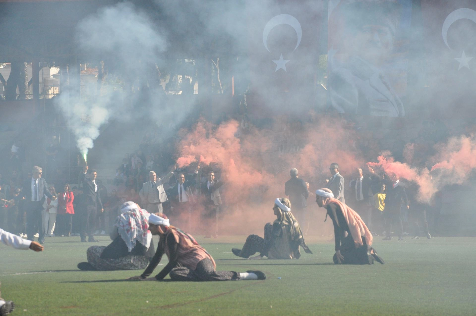 Bayındır İlçe Stadı'nda düzenlenen tören saygı duruşunda bulunması ve İstiklal Marşı'nın okunmasıyla başladı.