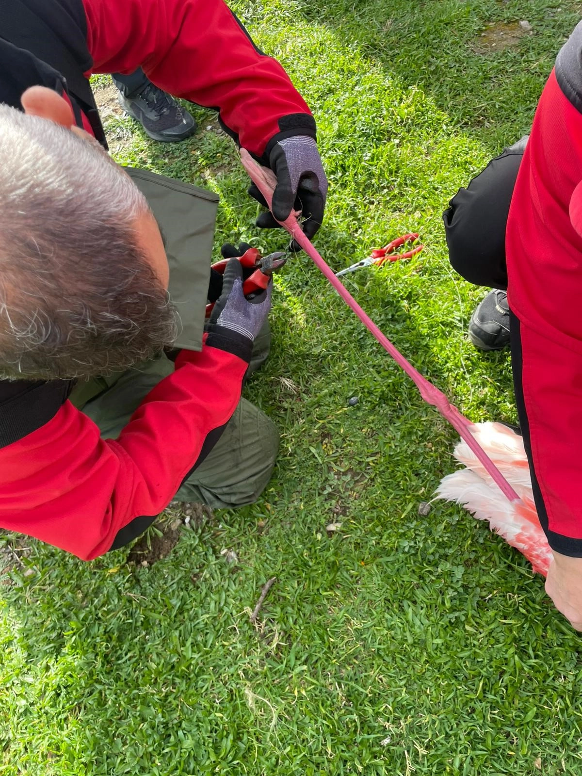 Flamingo kıyıya çıkarıldı. Ayağındaki hareket kabiliyetini kısıtlayan misina kesildi.