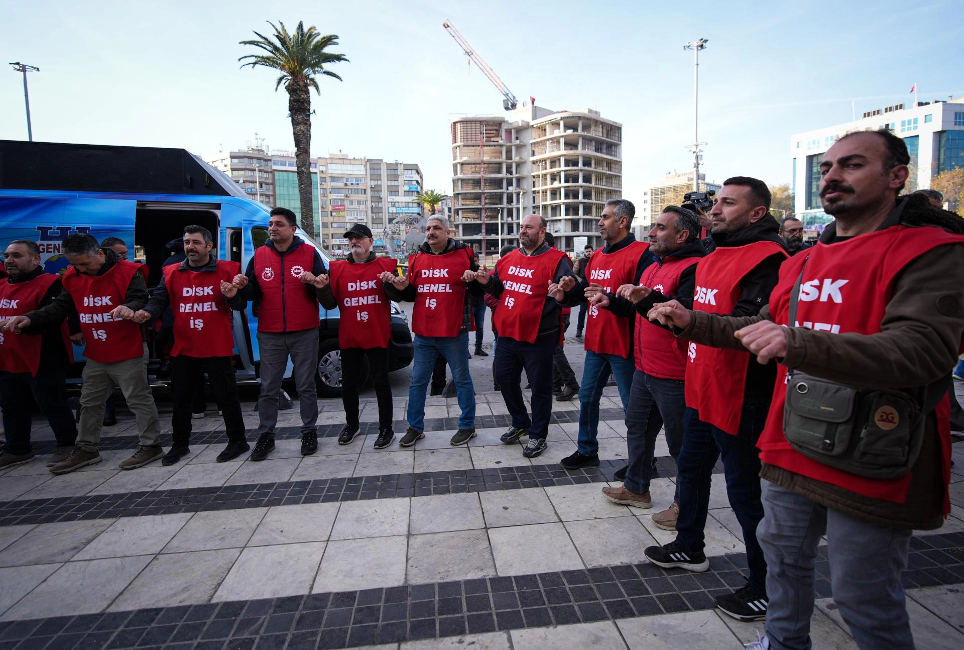 Genel-İş Sendikası üyesi işçiler ve sendika temsilcileri, Konak Atatürk Meydanı yakınlarında toplandı.