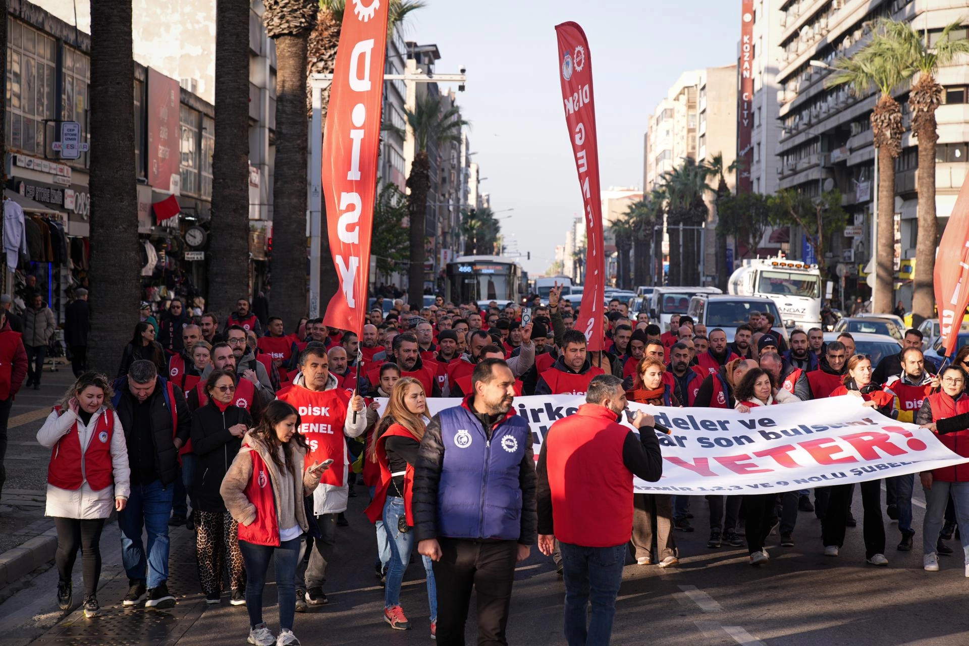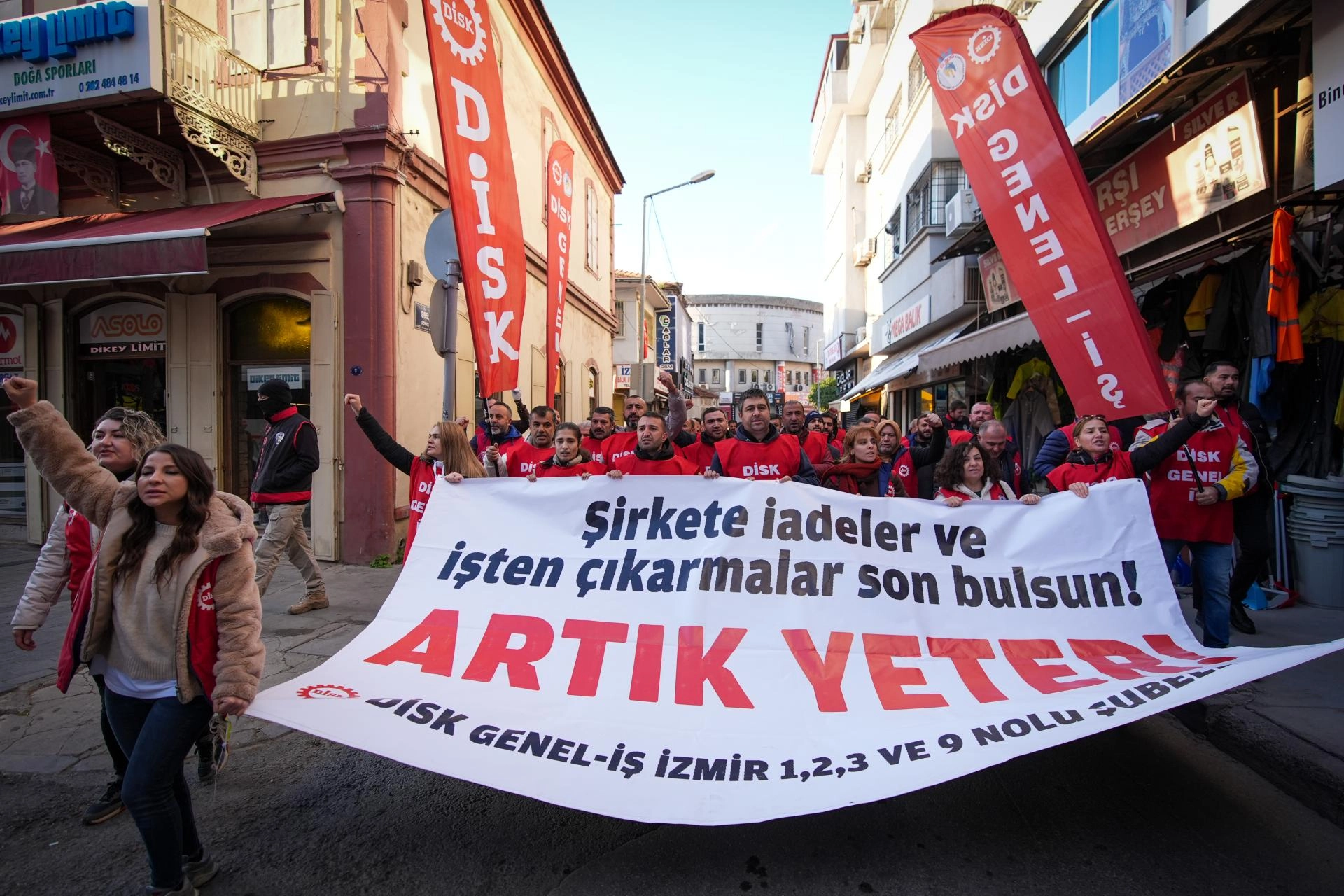 "Şirkete iadeler ve işten çıkarmalar son bulsun, artık yeter" yazılı pankart açan ve çeşitli sloganlar atan işçiler, Fevzipaşa Bulvarı'ndan Kültürpark 9 Eylül Kapısı'na yürüdü.