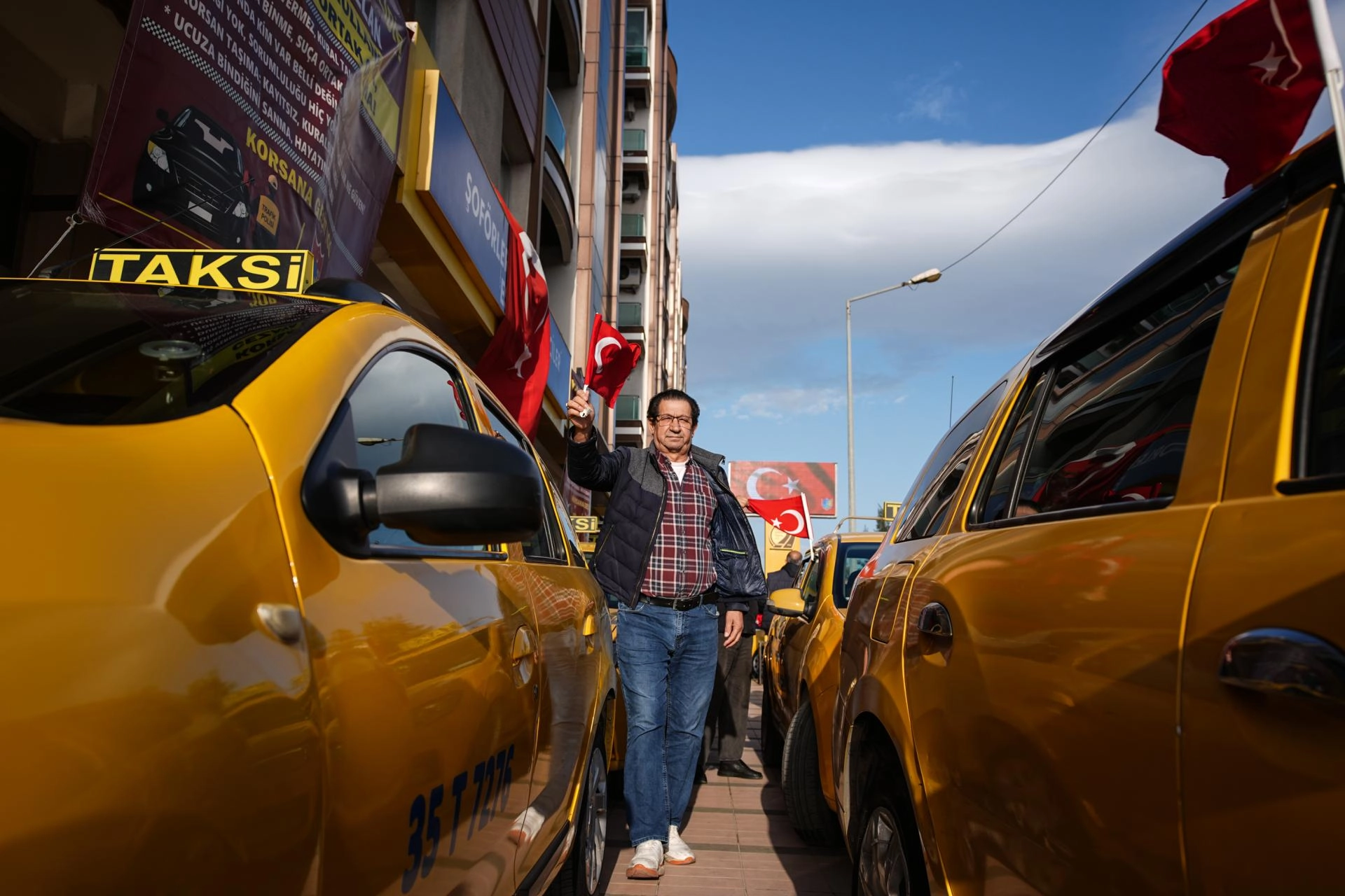 İzmir Şoförler ve Otomobilciler Esnaf Odası binası önünde bir araya gelen taksiciler, oda binası ve taksilerine Türk bayrakları astı.