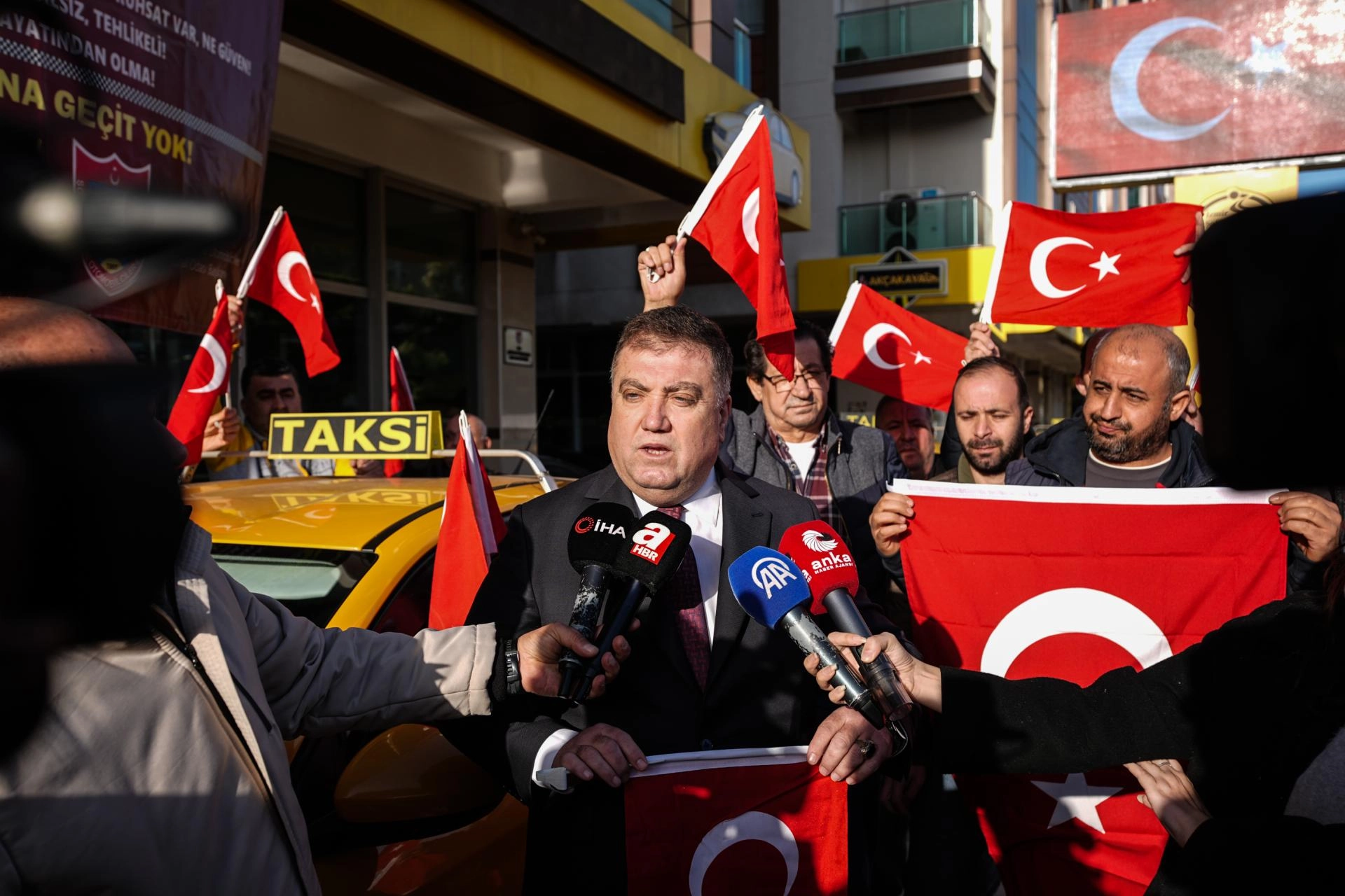 Açıklamaların ardından konvoy oluşturan taksiciler korna çalıp ellerindeki Türk bayraklarını salladı.
