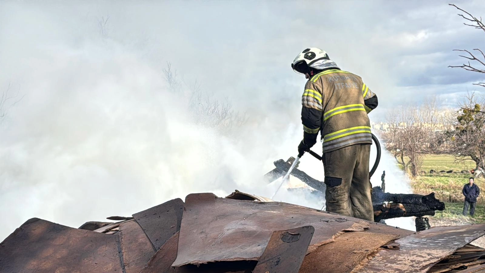 Polis ekiplerinin çevrede güvenlik önlemi aldığı olay yerinde itfaiye ekipleri, yangını söndürmek için çalışma yaptı.