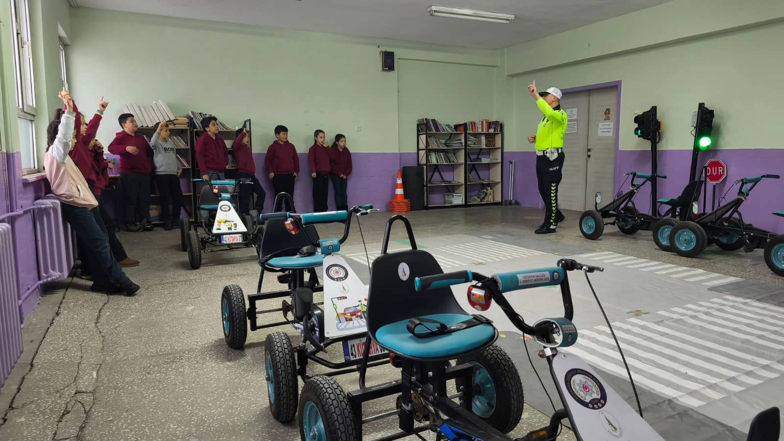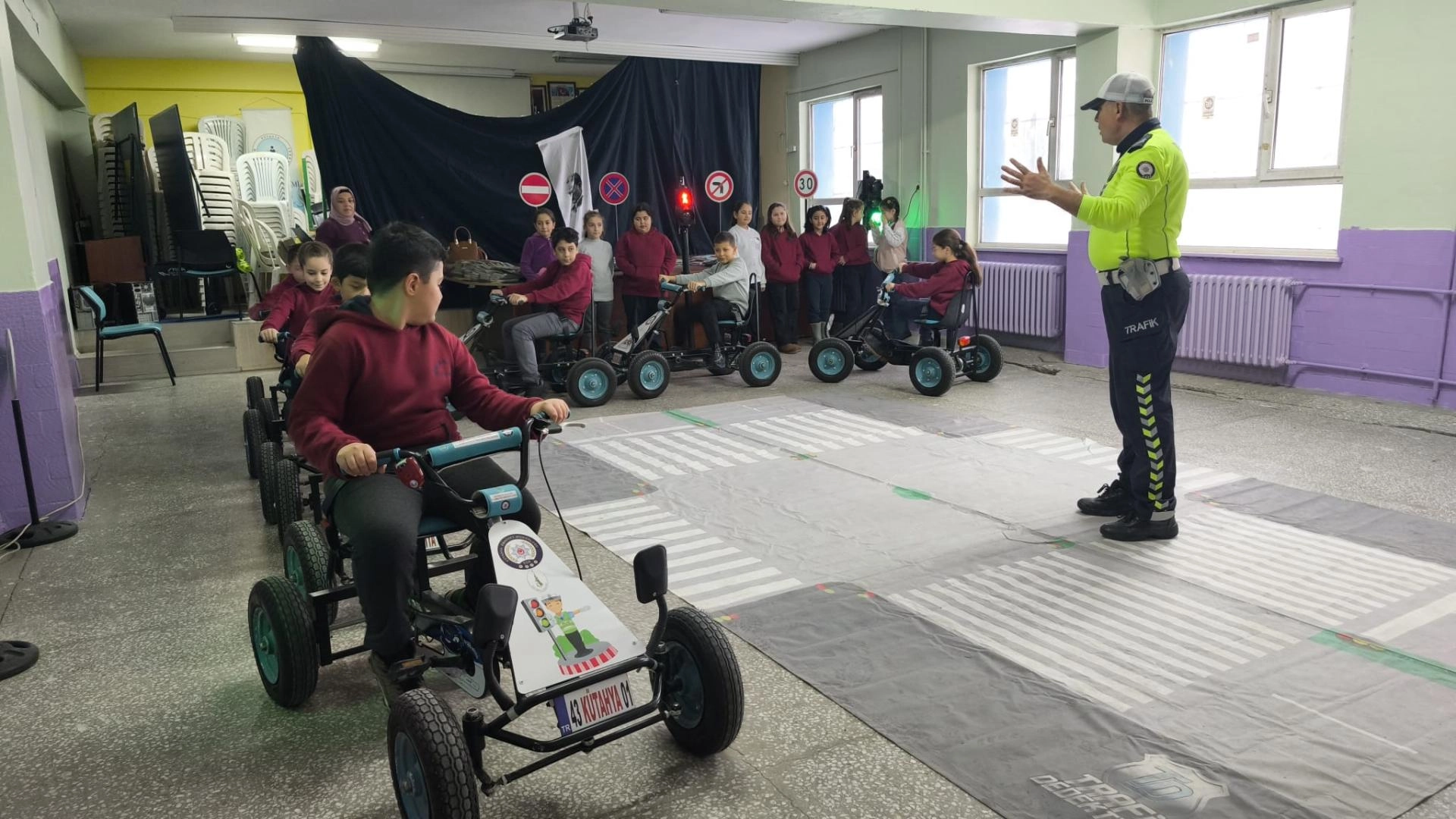 Okulun çok amaçlı salonunda oluşturulan özel eğitim parkurunda bisiklet ve go-kartları kullanarak parkurdaki minyatür yol ve kavşaklardan geçen öğrenciler, öğrendikleri bilgileri pekiştirme imkanı buldu.