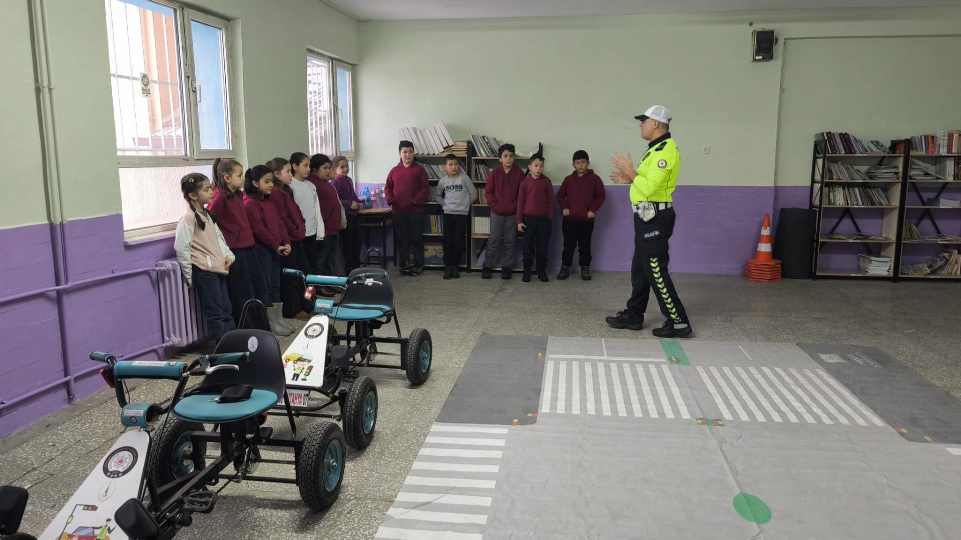 Kütahya İl Emniyet Müdürlüğü Trafik Tescil ve Denetleme Şubesinde görevli kıdemli başpolis Ahmet Kahraman, Mehmet Akif Ersoy İlkokulundaki öğrencilere trafik güvenliğinin önemi anlattı.