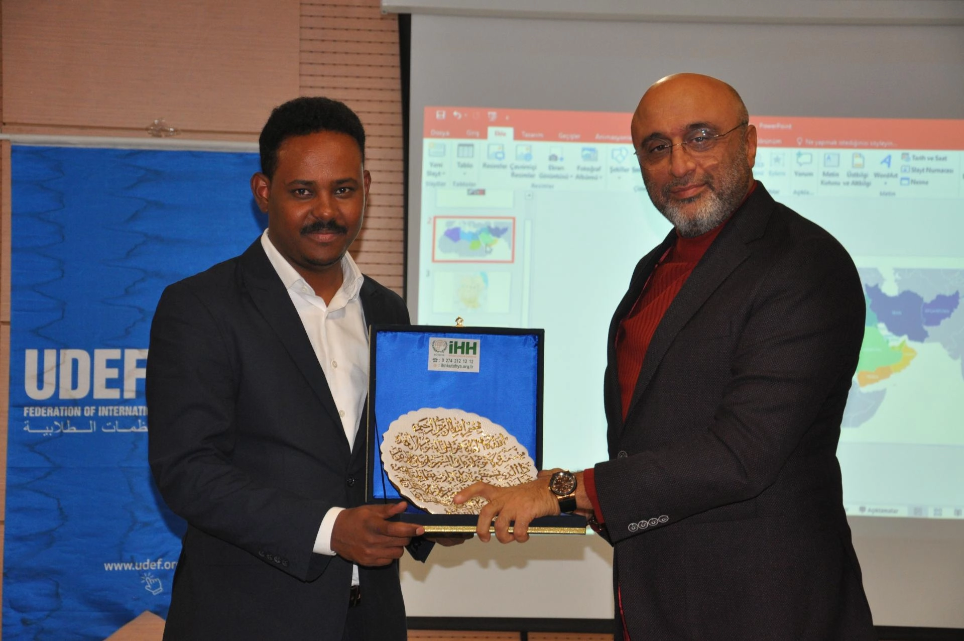 Konferansın ardından, Kütahya İHH İnsani Yardım Derneği Başkanı Mustafa Yenipazar, Nasır'a hediye takdim etti.