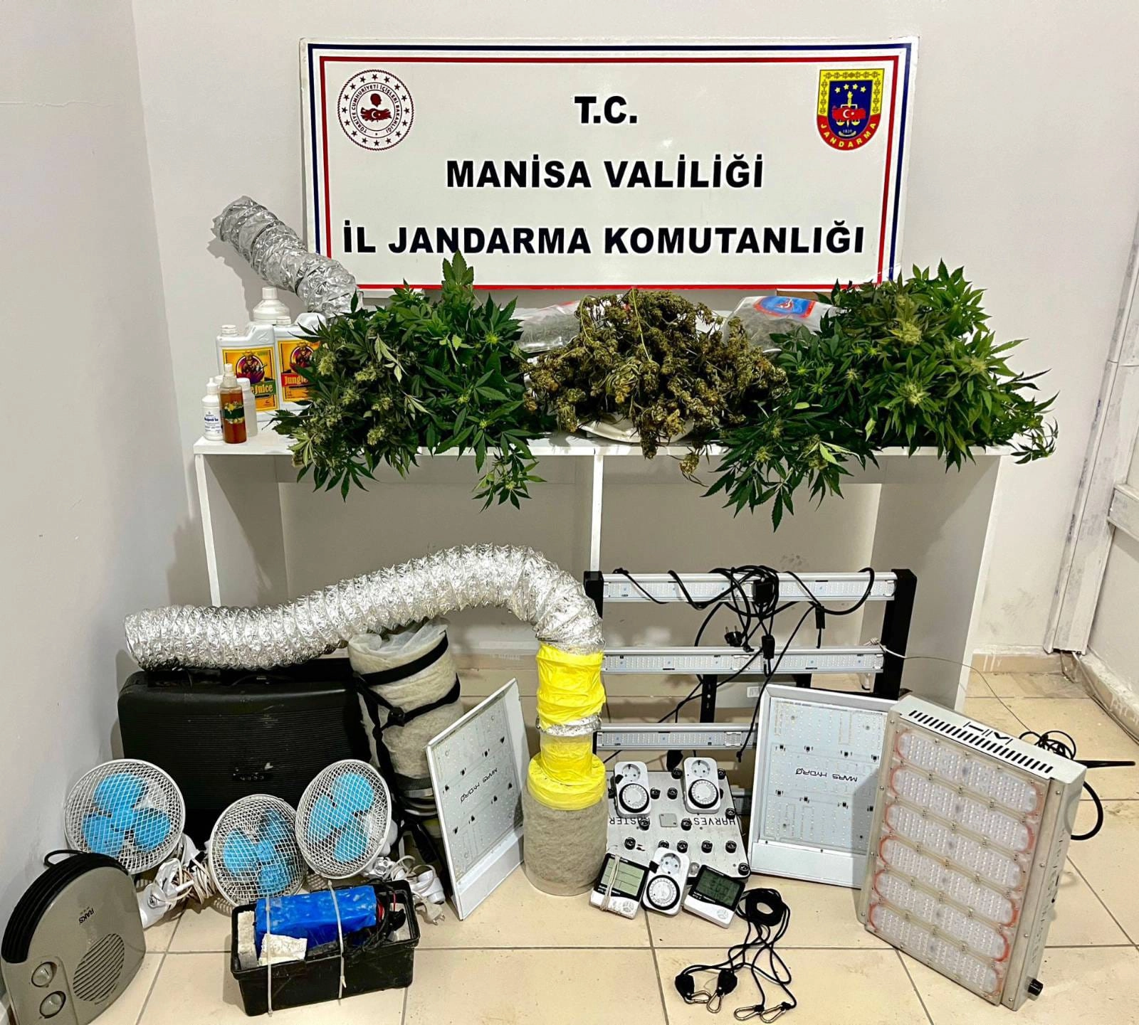 Manisa İl Jandarma Komutanlığı ekipleri, Yunusemre ilçesinde uyuşturucu imalatı ve ticareti yaptıkları belirlenen T.İ. ve S.T. isimli şüphelilerin adresine operasyon düzenledi. Yapılan detaylı incelemede, şüphelilerin evin bir bölümünü kenevir yetiştiriciliğine uygun hale getirmek amacıyla aydınlatma, ısıtma ve havalandırma sistemleriyle donatarak bir sera düzeneği oluşturdukları tespit edildi. Aramalarda 1 kilo 506 gram kubar esrar, 50 gram skunk, 93 kök kenevir bitkisi ile satışa hazır esrar ve kenevir tohumu ele geçirildi. Ayrıca, kenevir yetiştiriciliğinde kullanılan sera ekipmanlarına da el konuldu. Gözaltına alınan 2 şüphelinin jandarmadaki sorgu işlemleri devam etmekte olup, olaya ilişkin detaylı soruşturma sürdürülmektedir. Bu operasyon, Manisa'da uyuşturucu ile mücadeledeki kararlılığı bir kez daha ortaya koymuştur.