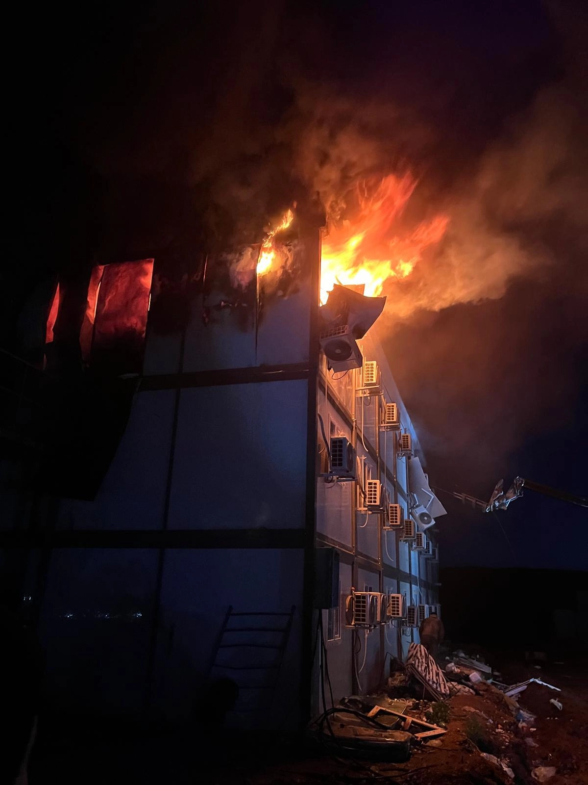 Şantiyede konaklayan yaklaşık 240 işçi hızla tahliye edilirken, itfaiye ekipleri alevlere müdahale etti.