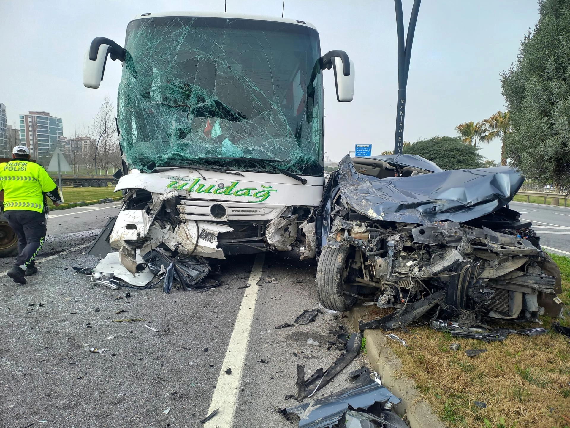 Otomobilin arkasında ilerleyen 10 HF 160 plakalı şehirlerarası yolcu otobüsü de kazaya karışan otomobile çarptı.