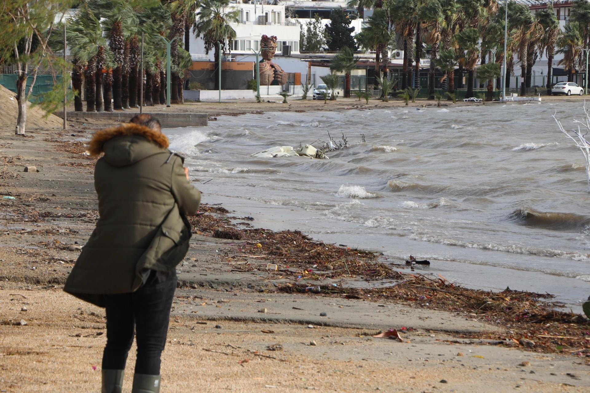 Sahil kenarındaki şezlonglar açığa sürüklenirken, yağış nedeniyle de denizin rengi değişti. Fırtına nedeniyle deniz suyu zaman zaman yoldan aşarak işletmelere ulaştı.