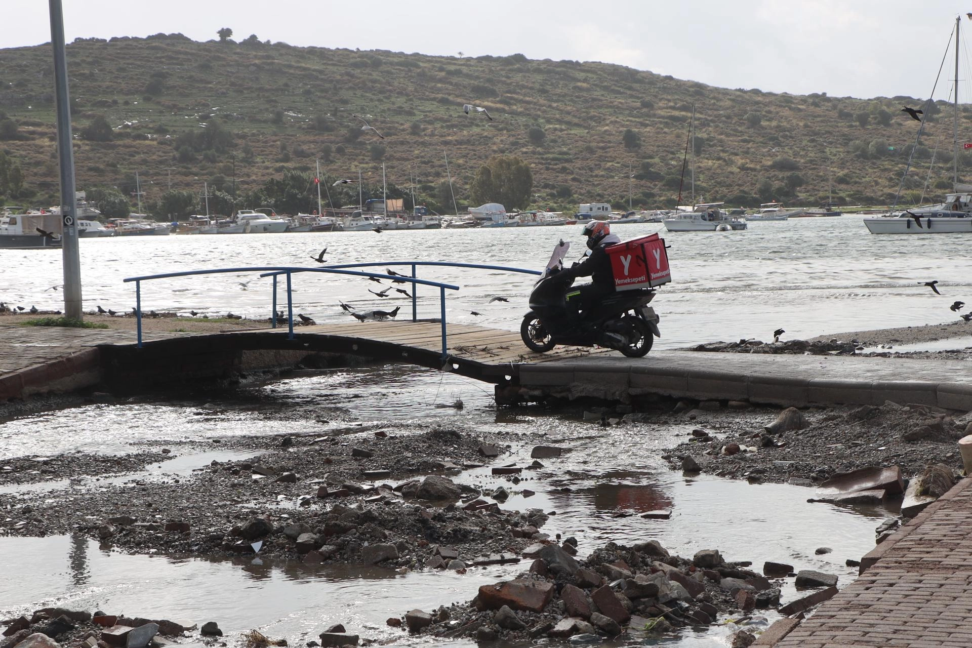 İlçede 10'dan fazla evi su basarken ekipler sıkıntı yaşanan bölgelerde çalışma yaptı. Gümbet ve Bitez mahallelerinde de bazı tekneler fırtına nedeniyle kıyıya sürüklendi. Denizin renginin de değiştiği ilçede derelerin debisi yükseldi.