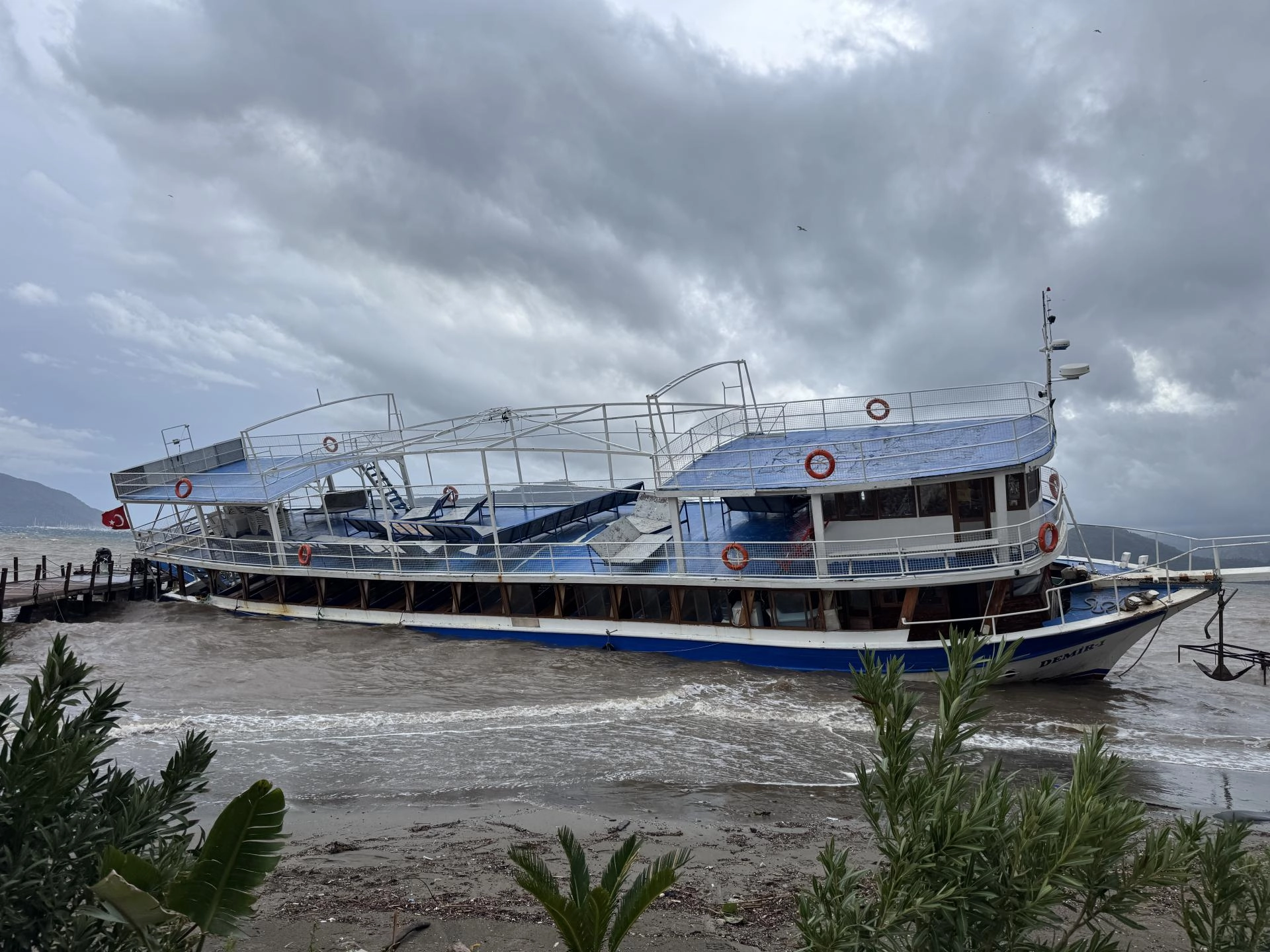 Siteler Mahallesi Uzunyalı Plajı'nda günübirlik gezi teknesi rüzgarın etkisiyle kıyıya sürüklenerek alabora oldu.