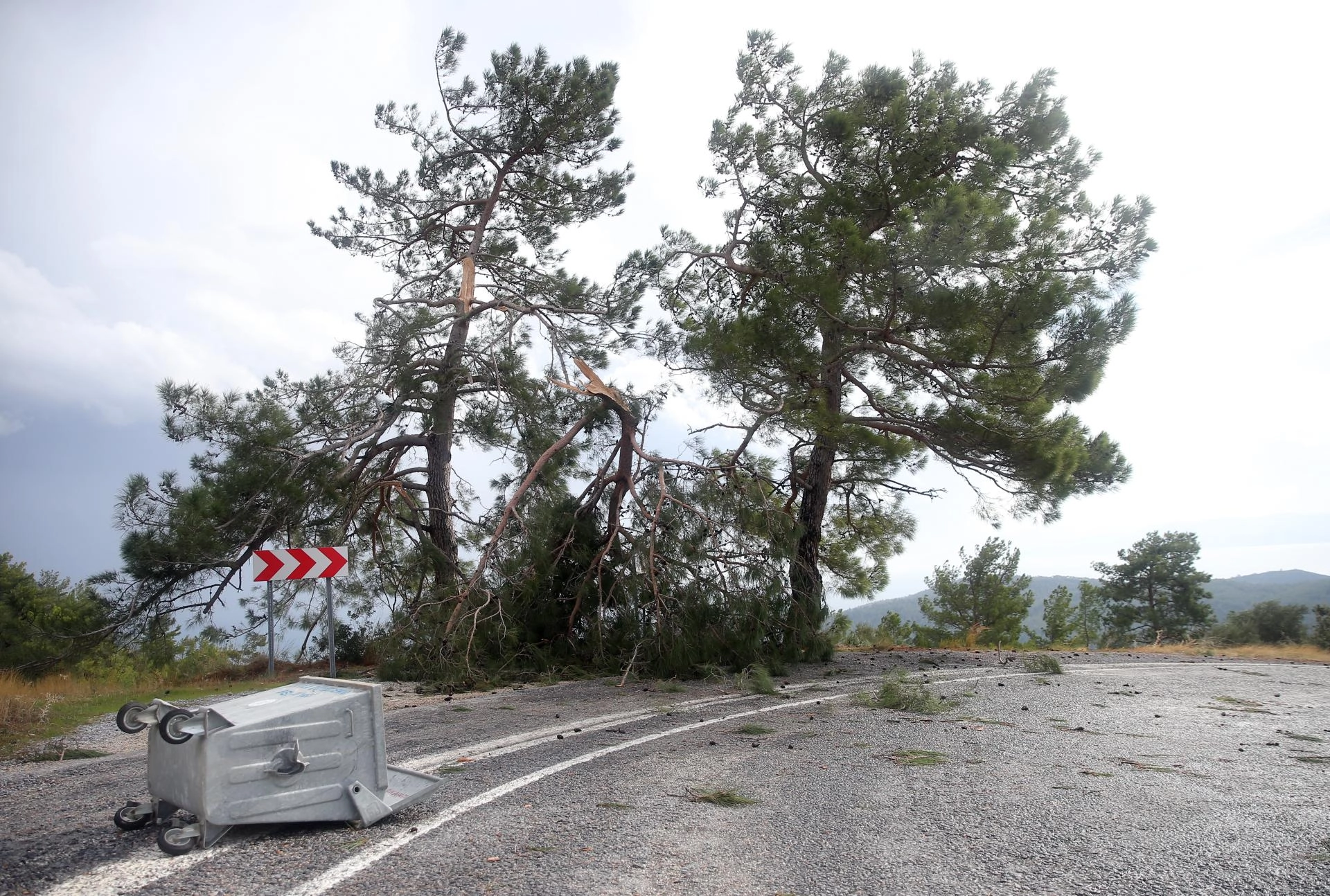 Bölgede etkili olan fırtına nedeniyle Akbük-Muğla kara yolu kenarında bulunan çam ağaçları ve çöp konteynerleri de devrildi.